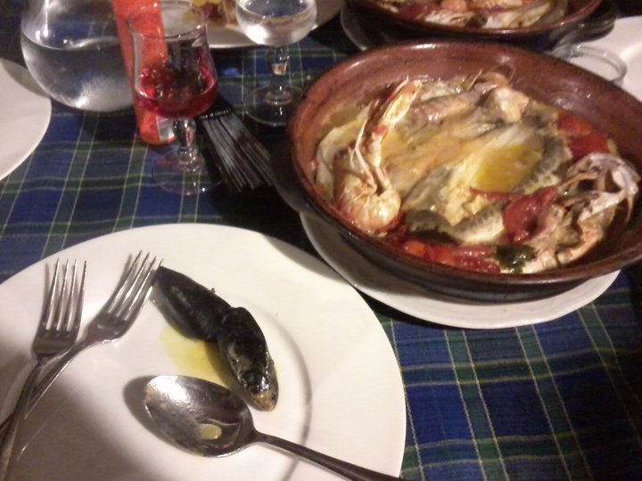 1,5 Kg di pesce: , triglie, sogliole, testone, tracine, palombo, razza, merluzzo, calamari o seppie, scorfani, lucerne, gamberi e gamberetti, cicale, pesci di scoglio